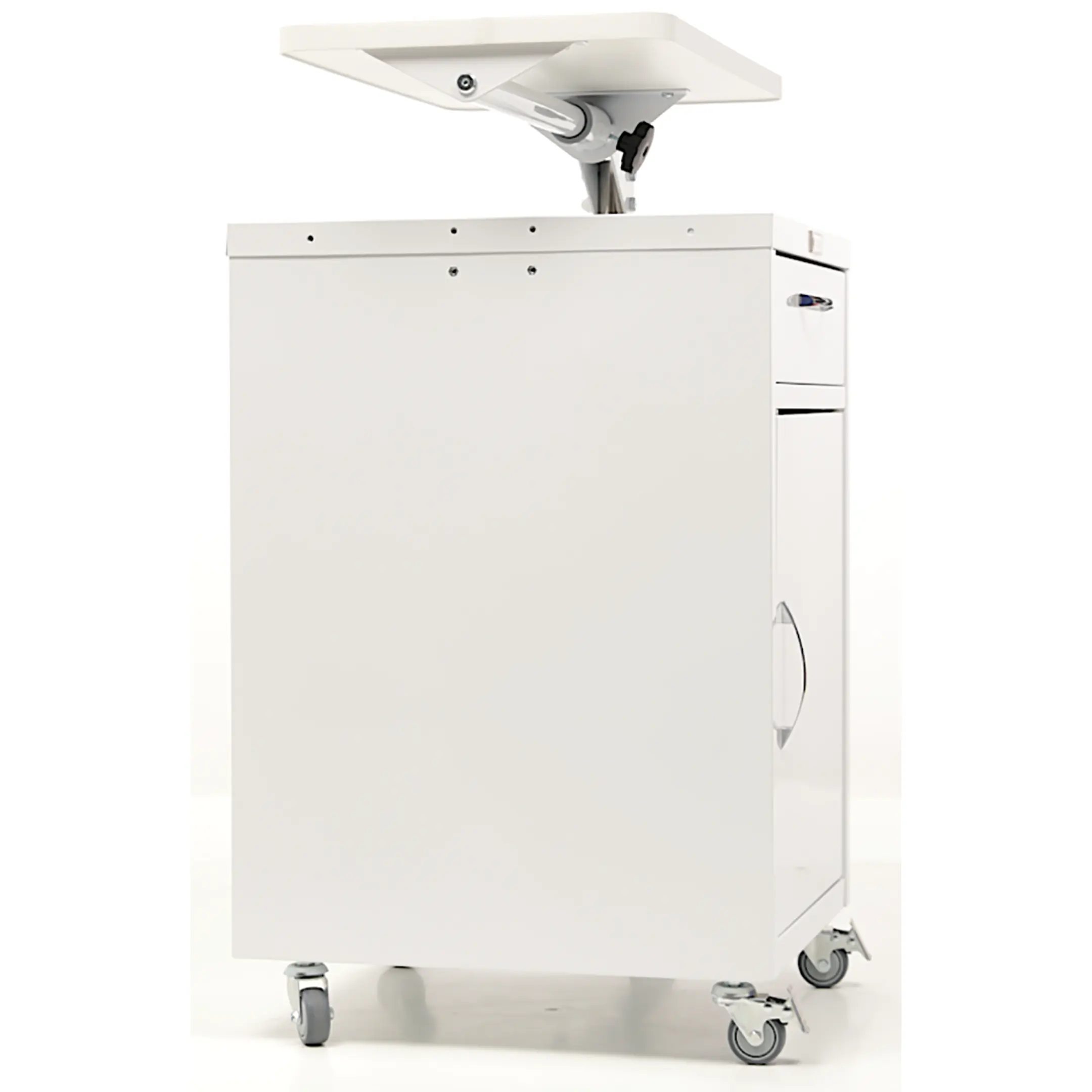 • Тумба оборудована колесными опорами из немаркой серой резины. Сбоку тумбы установлена дополнительная опора с пятым колесом с целью предотвращения опрокидывания изделия;