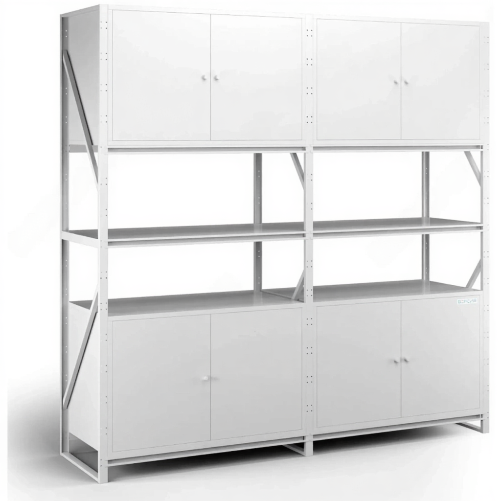 - Оптимизация логистики и удобство доступа — четкое разделение на зоны (нижний, средний, верхний ярус и антресоли) позволяет классифицировать инвентарь по весу, габаритам и частоте использования. Для доступа к антресолям часто используется стационарная или приставная лестница.