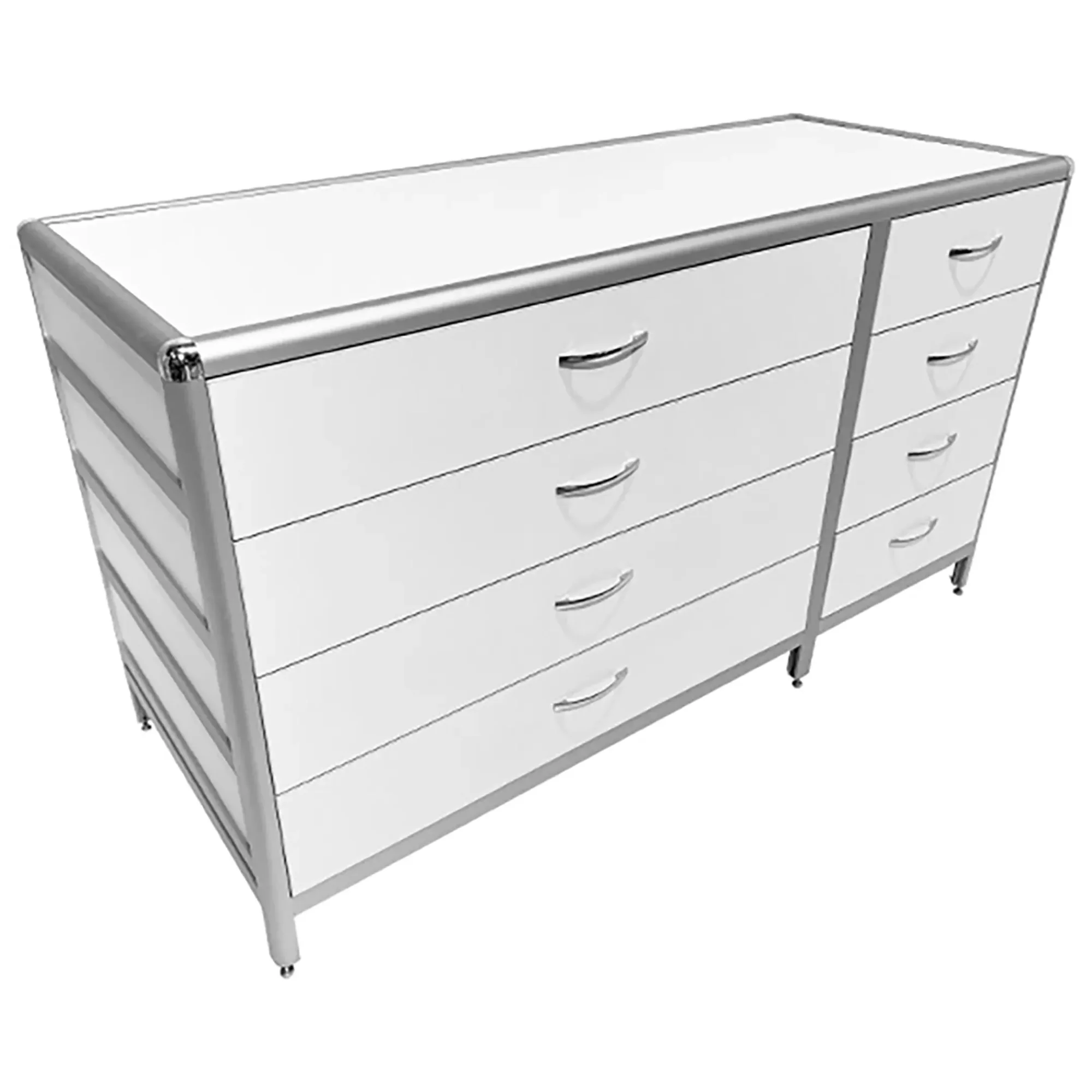 Стол-тумба лабораторная MED 12.016al (белый) — это функциональное решение для хранения лабораторного инвентаря, приборов и материалов в лабораториях и медицинских учреждениях. Модель разделена на два вертикальных отдела (большой и маленький), каждый из которых оснащен четырьмя выдвижными ящиками. Каркас выполнен из алюминиевого профиля, столешница из ЛДСП толщиной 16 мм.