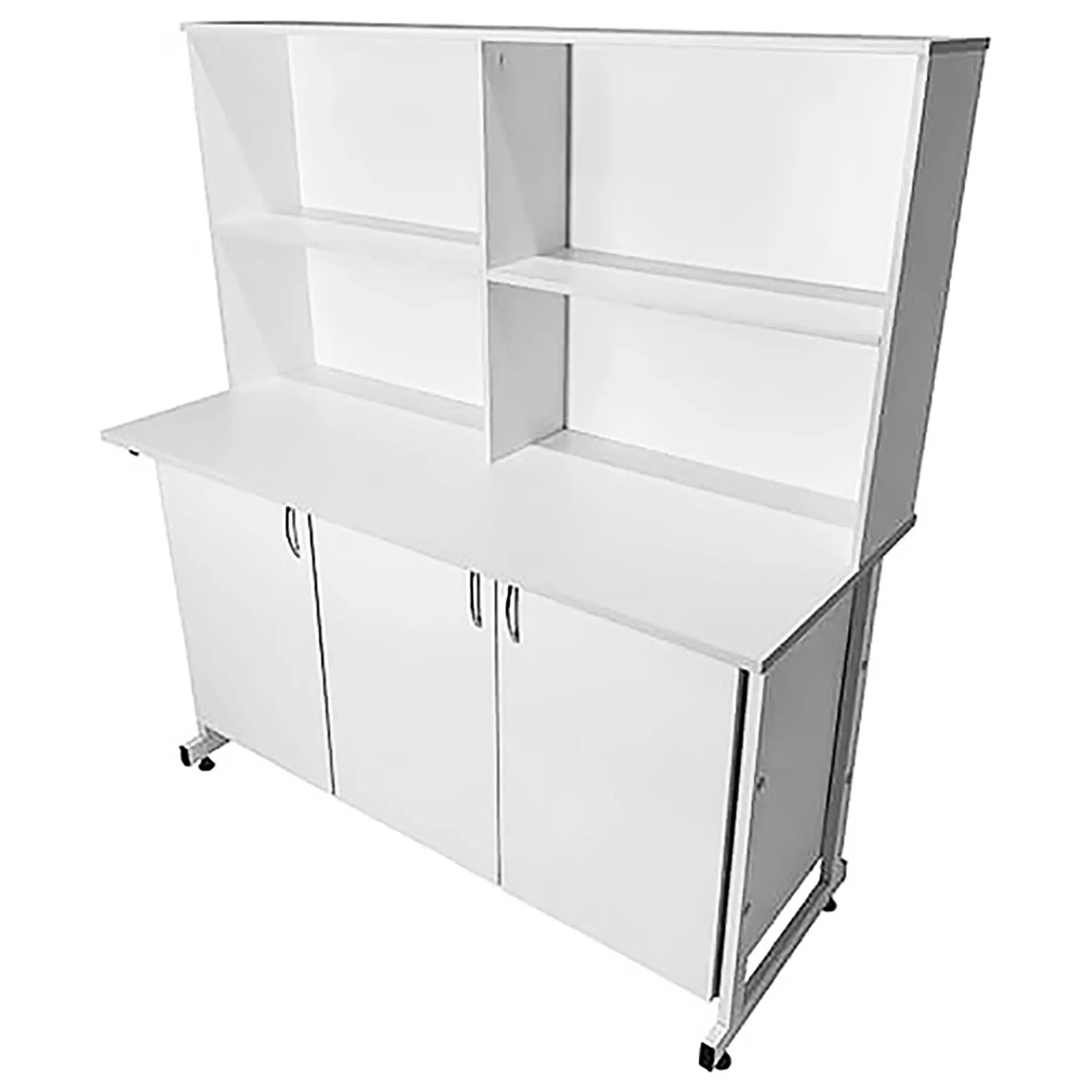 Стол-тумба лабораторная СТл 18.009 с надстройкой (белый) — это идеальное решение для организации рабочего пространства лаборанта, занимающегося проведением химических исследований и нуждающегося в хранилище для различных предметов. Модель оснащена слева отделением с распашной дверкой и полкой, справа — отделением с двойными распашными дверцами и полкой, а также надстройкой с четырьмя нишами. Каркас выполнен из стального профиля, столешница из ЛДСП толщиной 22 мм.