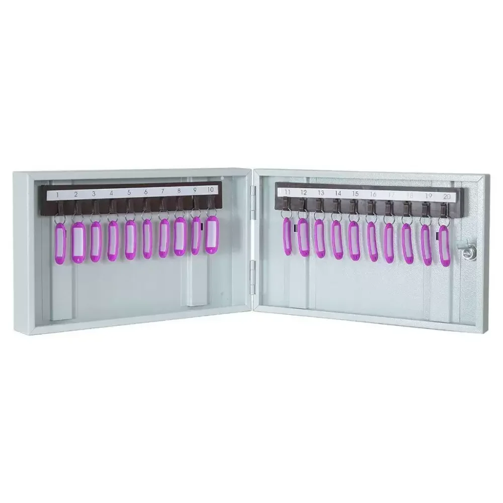 - Готовая система для быстрой организации учета — двадцать пронумерованных ячеек и комплект брелков создают простую и наглядную систему. Это позволяет моментально начать систематизацию, мгновенно находить нужный ключ и вести элементарный, но точный учет их выдачи.