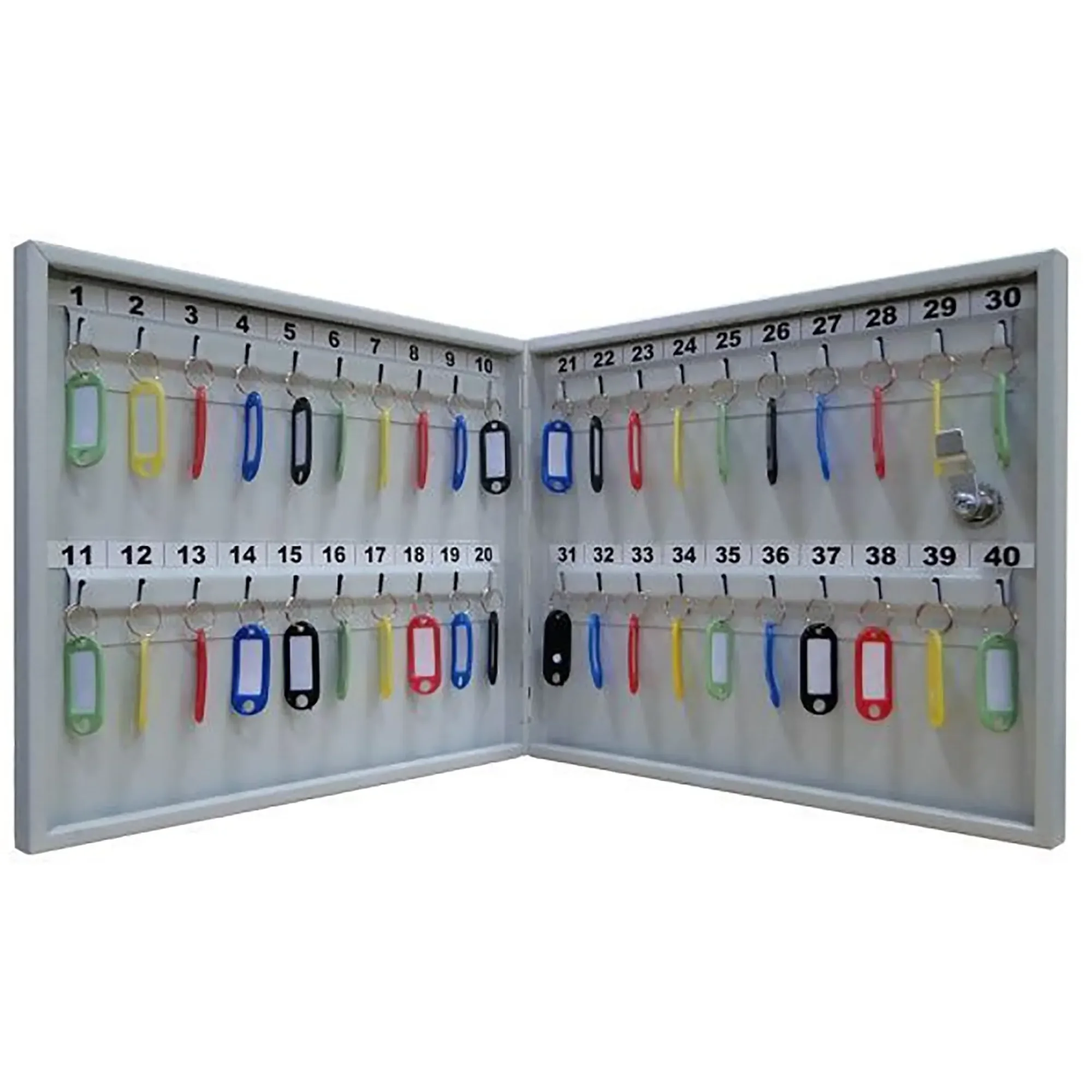 - Прозрачная организация и мгновенный поиск — сорок пронумерованных ячеек и комплект брелков создают понятную и наглядную систему. Это позволяет моментально находить нужный ключ, избегая путаницы, и вести простой учет их выдачи, что экономит время и нервы персонала.