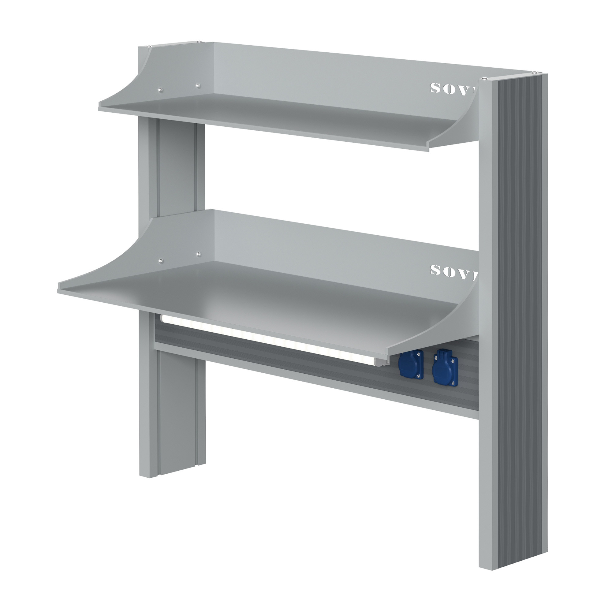 - Оптимальная организация пространства — стеллаж предназначен специально для пристенных столов, что позволяет эффективно использовать вертикальное пространство лаборатории.