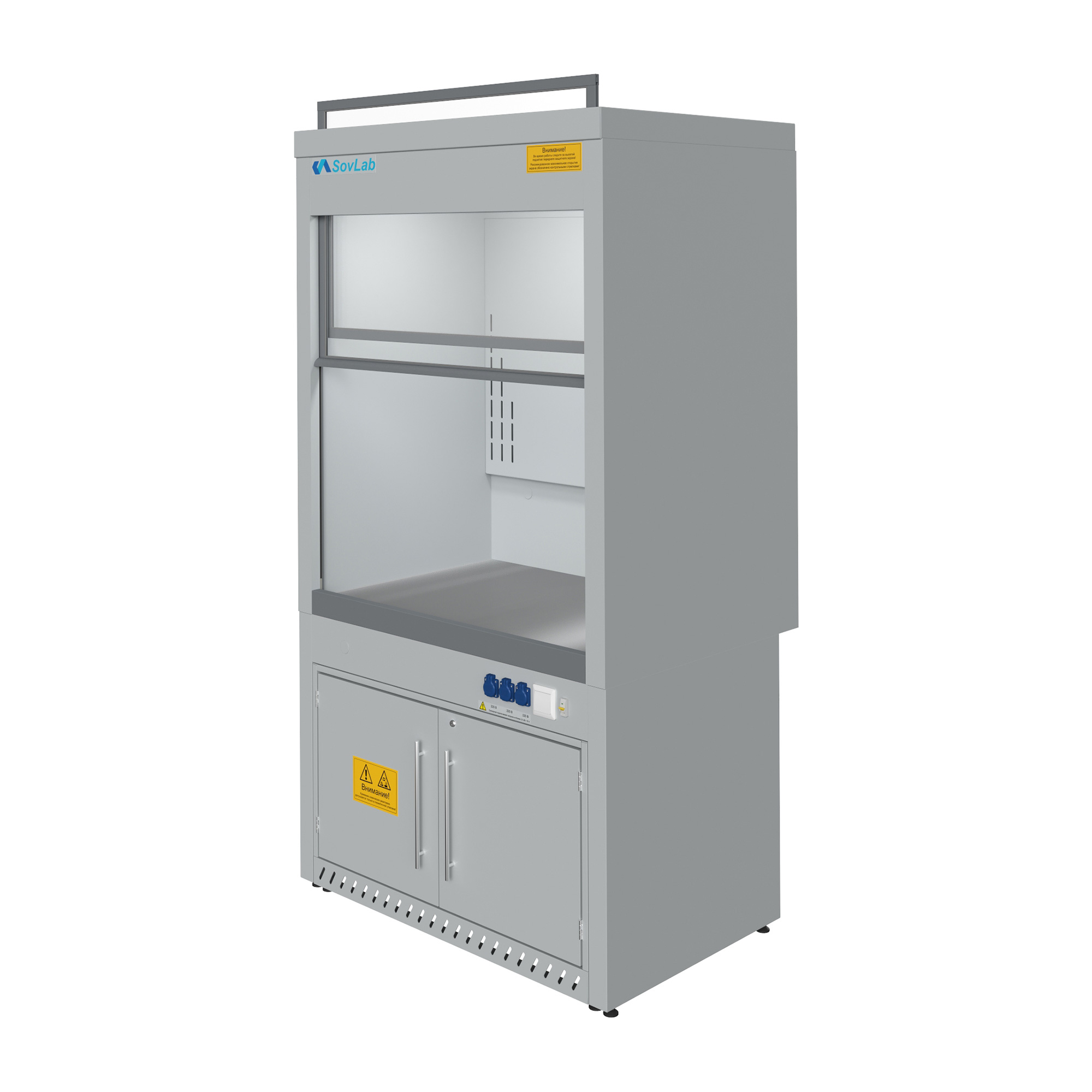 - Безопасная работа с летучими веществами — вертикально-подъемный защитный экран из ударопрочного стекла с системой противовесов для плавного хода и фиксации.