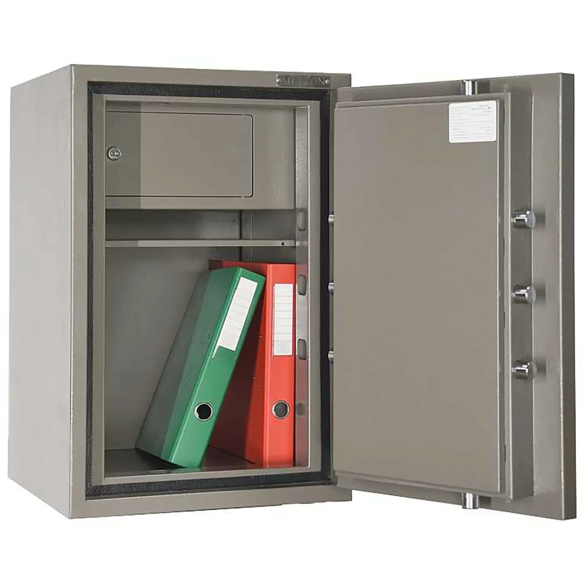Заготовка комплектующих для данного шкафа производится методом лазерной резки, что позволяет добиться высокого качества и эстетичного вида изделия. Разработанная конструкторско-техническим отделом нашей фирмы система запирания двери, обеспечивает надежную фиксацию двери в закрытом состоянии. Мощные ригеля d 24 мм с защитой от высверливания и выбивания способны выдержать высокие нагрузки возникающие при попытке несанкционированного открывания двери Вашего сейфа. Наличие анкерного крепления к полу позволяет обезопасить Ваш сейф от изъятия из помещения.