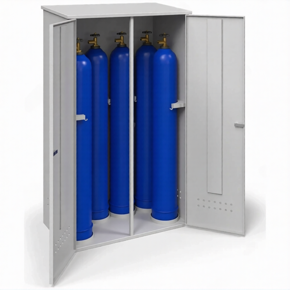 - Надежная защита имущества и соответствие нормативам — запирающаяся на замок дверь защищает баллоны от краж и несанкционированного использования. Использование сертифицированного шкафа такого типа является самым простым и эффективным способом выполнить предписания пожарного надзора и правила безопасности для сосудов, работающих под давлением, избежав штрафов.