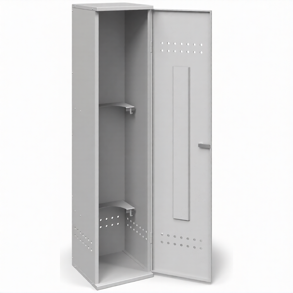- Надежная защита от хищений и внешних воздействий — усиленная конструкция и надежные запирающие механизмы защищают баллон от кражи и несанкционированного доступа. Шкаф также предохраняет баллон от дождя, снега, пыли и механических повреждений при установке под навесом или в помещении.