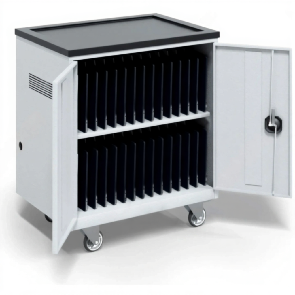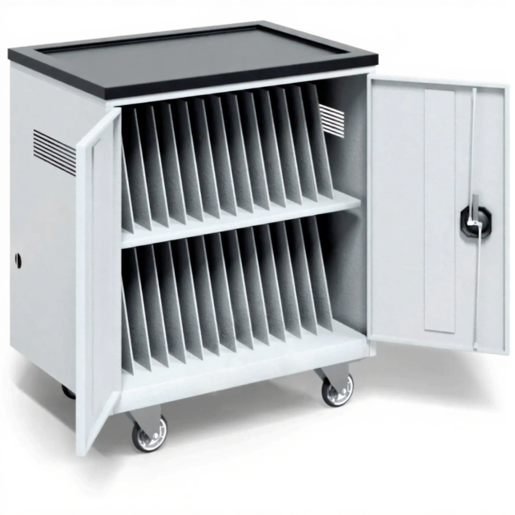 Тележка для хранения 30 ноутбуков и планшетов 17,3 дюймов — это мощное и профессиональное решение для централизованного управления, транспортировки и зарядки большого парка мобильной электроники в образовательных и корпоративных средах. Модель представляет собой мобильный металлический сейф, рассчитанный на одновременное хранение до 30 ноутбуков или крупных планшетов с диагональю до 17,3 дюймов. Она обеспечивает безопасность, порядок и постоянную готовность к работе целого комплекта устройств, являясь основой для мобильных IT-классов или рабочих групп.