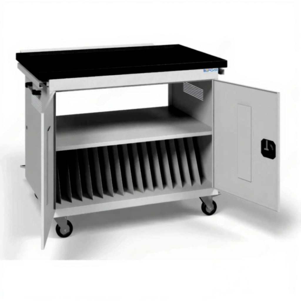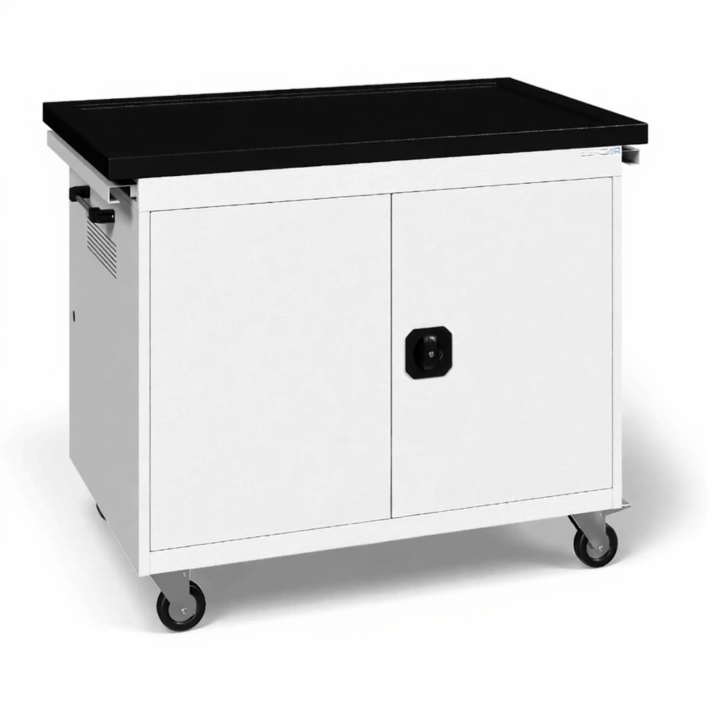- Экономия времени и простота обслуживания — полностью устраняет проблему поиска свободных розеток и отслеживания заряда каждого ноутбука. Администратору достаточно подключить тележку к сети, чтобы утром получить полностью готовый к работе комплект.
