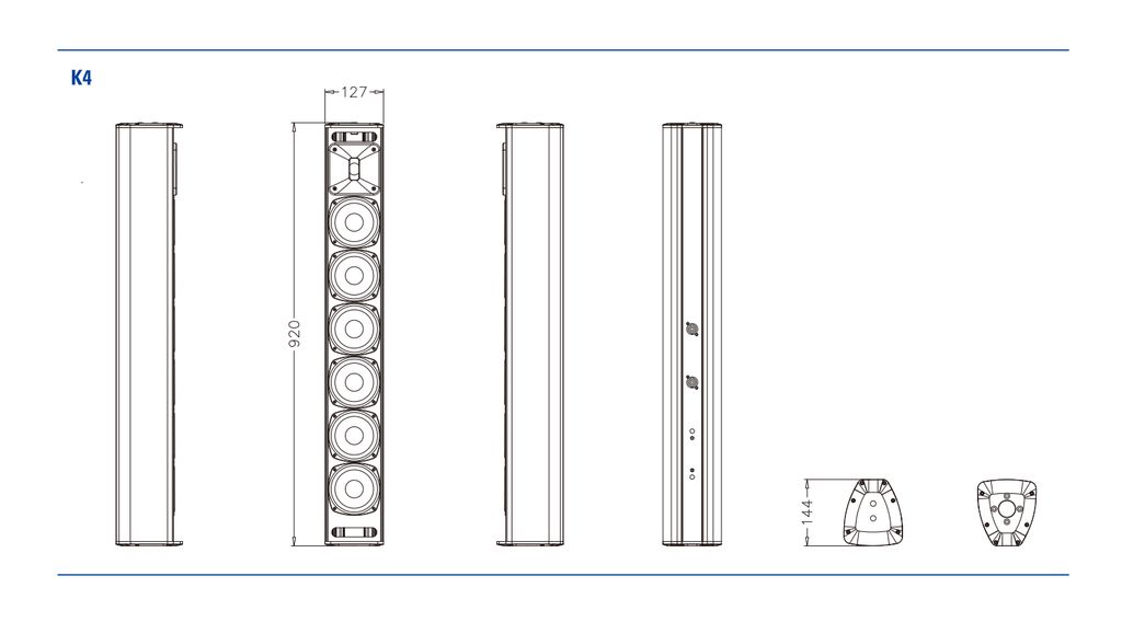 Система может устанавливаться на спикерную стойку 35мм, а также имеет возможность подвеса, что делает K4 универсальным решением для мобильных комплектов и для инсталляций. Благодаря комплектации 1X1.7" - высокочастотным и 6X4" – среднечастотными неодимовыми динамиками система обладает высокой чувствительностью, чистым и ярким звуком, а корпус из алюминиевого сплава делает её ударопрочной.