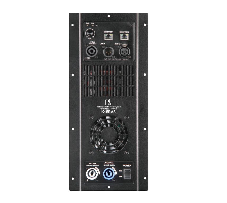 Встроенный двухканальный цифровой усилитель K15BAS способен дополнительно усилить пассивную колонну K4. Как и большинство активных акустических систем FDB Audio, K15BAS имеет поддержку DSP, с помощью которого можно гибко отстроить как сабвуфер, так и сателлит. Доступные параметры настроек: входной 31-секционный PEQ, выходной 10-секционный PEQ, задержка ввода/вывода от 0 до 25 мс, независимый полосовой фильтр, фильтры высоких и низких частот, независимое ограничение давления, шумоподавитель, компрессор.
